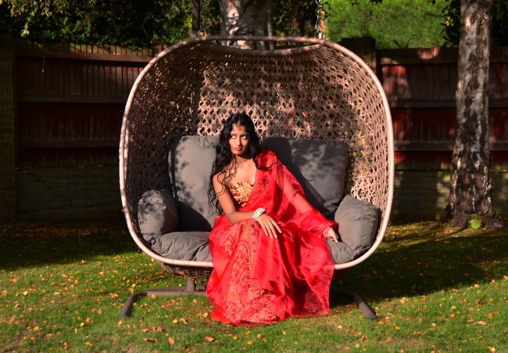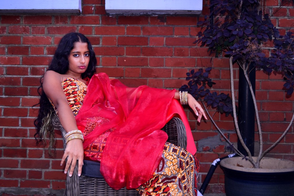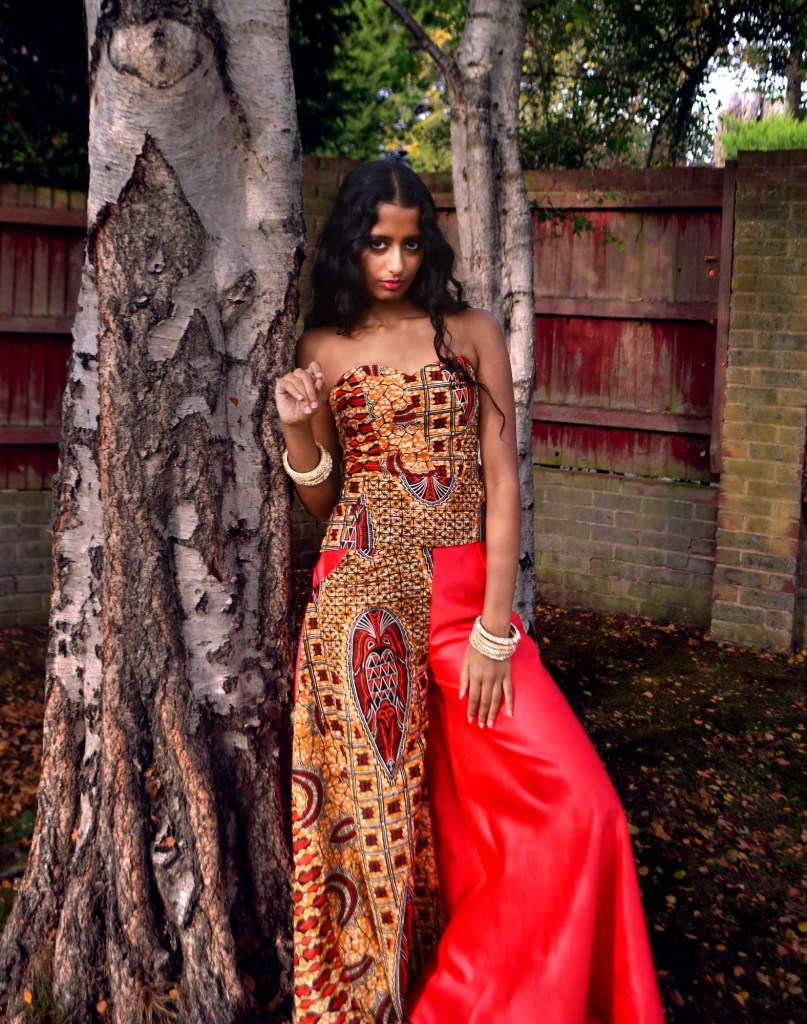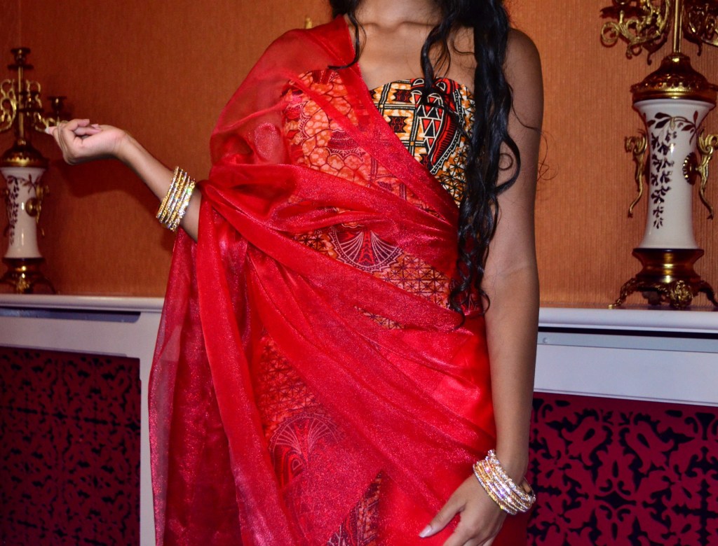 - Boateng designs her take on the pant sari, this ensemble consists of a strapless, asymmetrical blouse, a colour blocked sharara with front yoke pockets and a matching organza dupatta. Style the look with embellished drop earrings and simple necklace for a modern soirée.