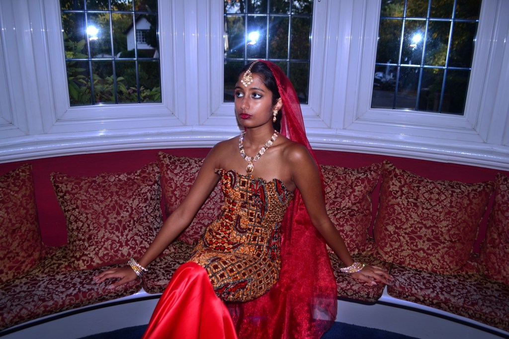 - Smocked dress with floor length bridal satin 360º peplum, net underskirt, and matching red organza dupatta.