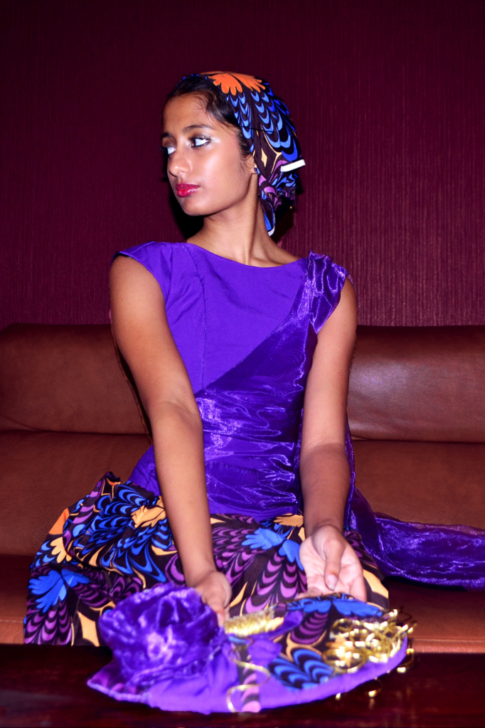 Fusion at its finest, OHEMMA RIYAR blends Sri Lankan and Ghanaian cultural dress as a symbol of harmony. The traditional dukuu and Nigerian hand fan accessorise the sari inspired dress, and Boateng’s goal of unity is most achieved within this piece.